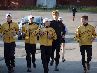 I warmed up with a Jason, Caitlin, Brad, Bryon Powell (irunfar.com), and Shiloh Meilke (Vasque). It was cool to be with lots of other people in yellow. After about 15 minutes of warming up I stripped down to the Sugoi La Sportiva Race singlet, Sugoi 42 k shorts and grabbed my Ultimate Direction hand bottle filled with EFS and headed to the starting line.