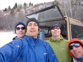 Just as called for we woke up to 26 degrees, wind and a light snow. Undeterred we met at Dusty's house at 8:00 ready to give it a go. Sheridan, a local runner who ran a lot with us this summer, drove straight from working all night to the house stoked to run his first ultra. We met Aaron Spurlock, an solid 100 mile runner from Pocatello, at the trail head. After a few minutes of trying to decide exactly what to wear for the first 20 miles we snapped the mandatory pre-run photo and headed off.