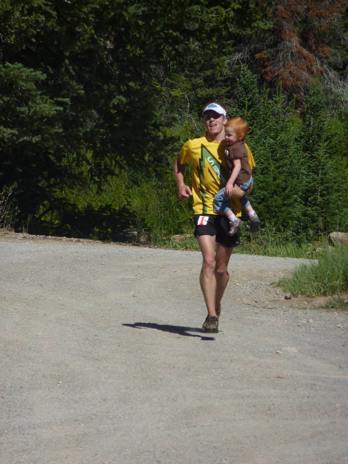 I did make it to the turn around a few minutes before the start, was able to swap my bottles and grab sunglasses faster than a Nascar pit stop thanks to the attentiveness of my wife who is a super crewer. I charged back out of the turn around, noted the time on my watch and rode the adrenaline wave away from all of the people. Jon Allen and I crossed paths about 7 minutes after I left the aid station so I knew I had a bit of a cushion, but I knew I had to keep pushing so he couldn't reel me in, and so I could stay ahead of the fresh legs of the 25k runners. I was still in the lead as I a passed the swift creek aid station, and was again stoked by the kids who were happy to see me still in first. Just out of the aid station I got caught by super strong ski mountaineering racing champion Pete Swenson. I am convinced that Pete is just legs and lungs and he hammered past, I kept with my plan of constant forward motion and let him go. He was running the 25k so I was still in a good place. I passed my favorite lake and the aid station folks told me I was the first runner back, which meant that Pete must have gotten off course. Suer enough about 10 minutes after the lake Pete caught me again, but this time we ran together for I while. I knew we were getting close to being done so it was time to bury the needle a bit. Pete finally broke me and pulled away at the bottom of the two huge switchbacks that make the climb up balls pass. He got ahead some but not out of sight and just after cresting the hill I was able to start reeling him in on the final descent to the finish. I passed Pete about 3/4 of the way down the hill and try to hammer to stay ahead. I hit the campground still in the lead and about 100 yards from the finish I spotted my 3 year old daughter Brynlee cheering my in. In a split second decision I scooped her up and started carrying her towards the finish, her extra weight made my calfs cramp and freak out with the extra load, but I hunkered down and finished just seconds ahead of Pete.