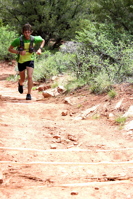 At 6:10am on Thursday morning Krissy and I both hit start on our watches and set out from the East Rim TH. We ran about the first 1/4 of a mile together and then drifted apart as our paces dictated. I relied heavily on the "relaxed is fast" mantra as I tried to keep my stride smooth and controlled, yet near the edge of what I thought could be maintained. Very fresh mountain lion tracks added a burst of adrenaline just as I started into echo canyon and down the descent towards the Weeping Wall TH. I pushed the leg turnover on the pavement to the grotto. At this point I confused Matt's splits a little and although I felt like I ran well, I thought I was behind. I crossed the bridge at the Grotto in 1:34:50. There Cherie from Ultraspire helped crew me by taking my Isomeric Race Handheld and handed me my Spry race vest with 20 oz of concentrated EFS Slurry and 60 oz of water.